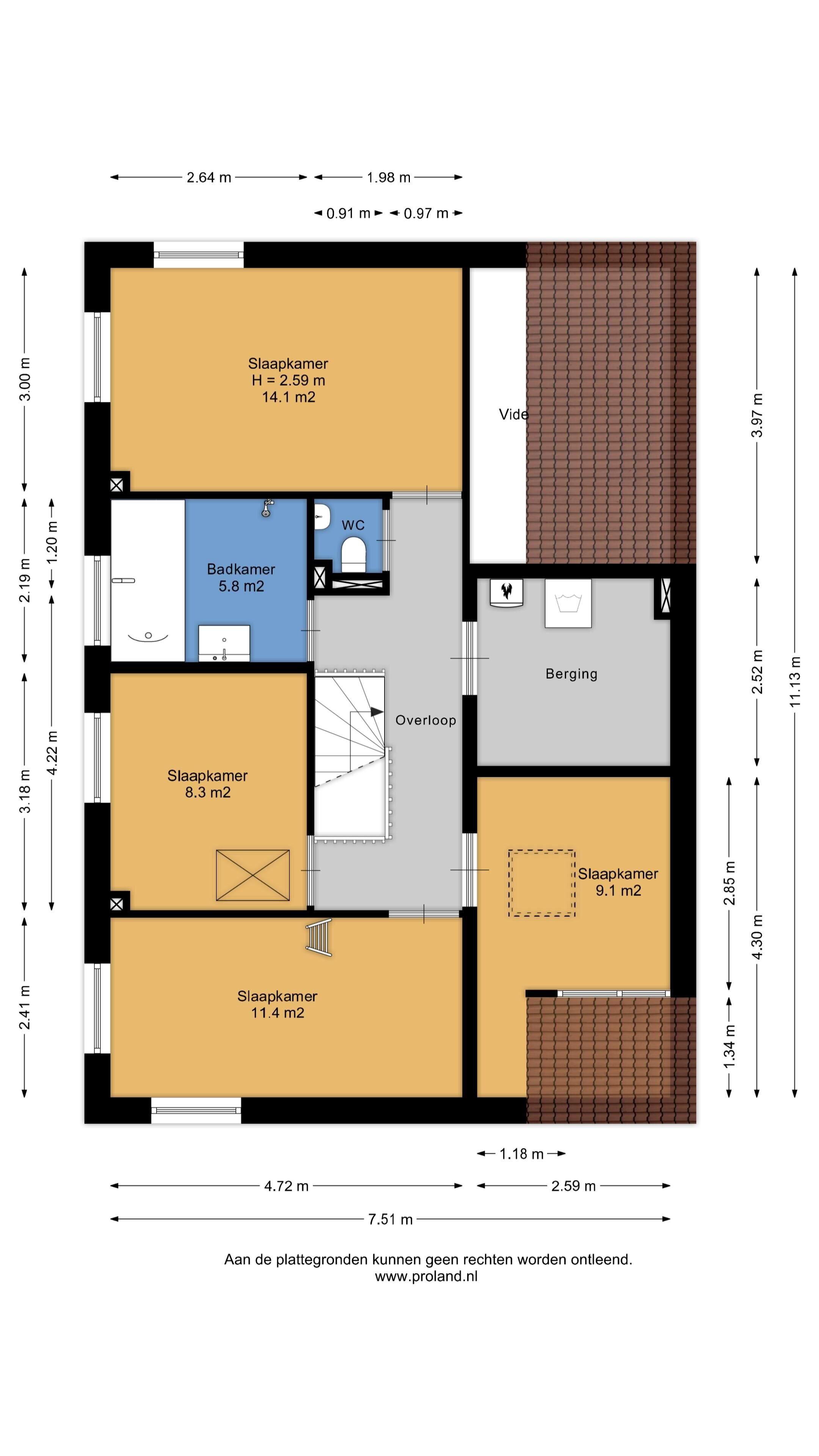 Eerste verdieping: overloop, vier slaapkamers van respectievelijk 8,3 m², 9 m², 11,4 m² en 14 m². De badkamer is voorzien van een inloopdouche met nieuwe douchewand, een ligbad en een wastafelmeubel. Aan de overloop bevindt zich een separaat tweede toilet en een grote berging met wasmachineaansluiting.